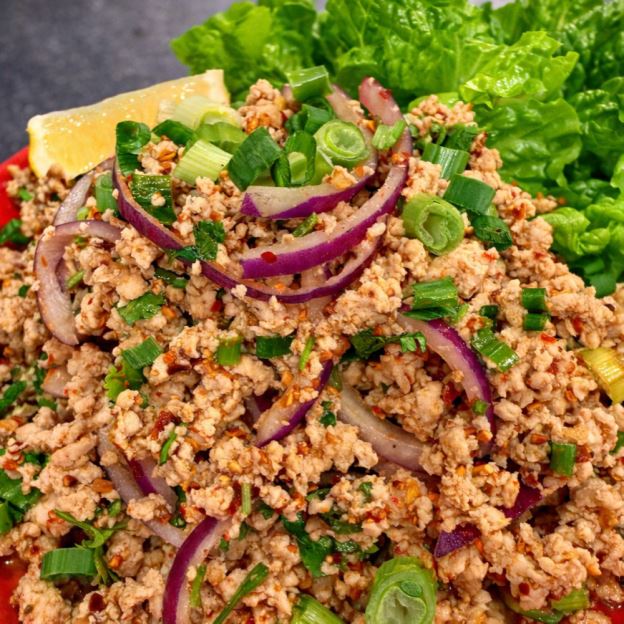 Minced chicken, water chestnuts and green onions stir-fried in a light brown sauce. Served with lettuce cups.