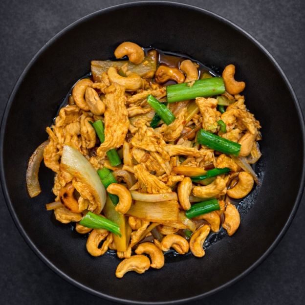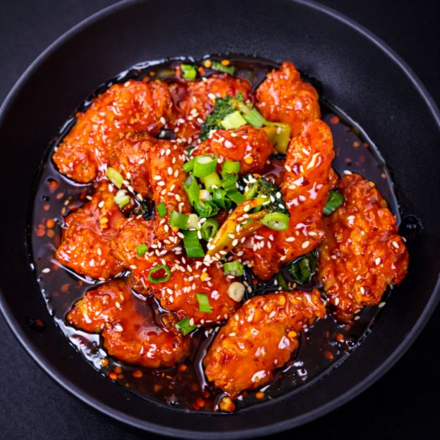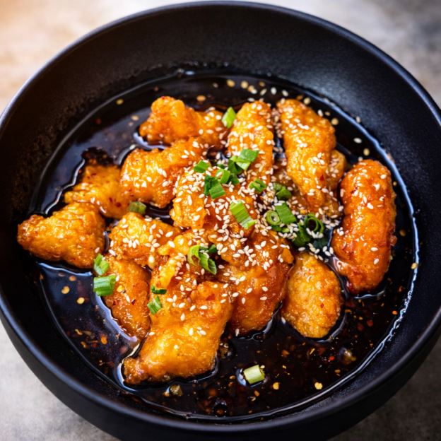 Breaded chicken stir-fried in orange chicken sauce, topped with chop green onion and sesame seed