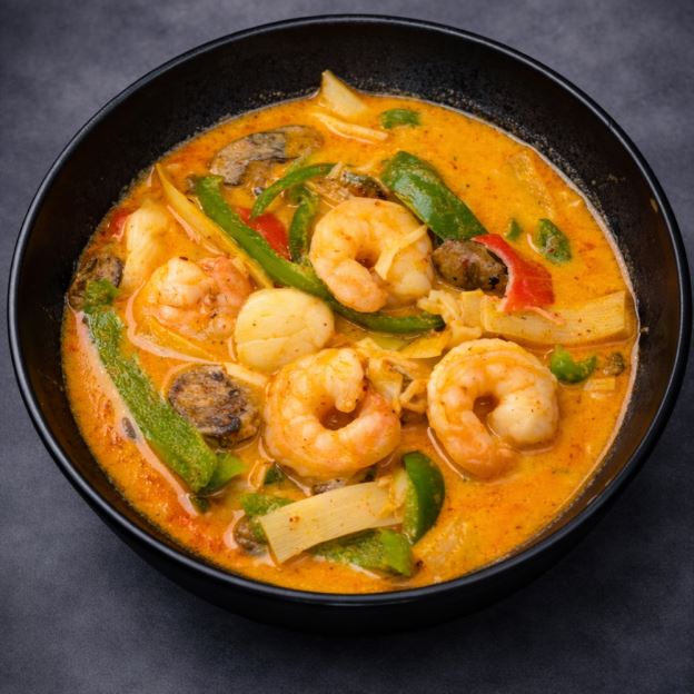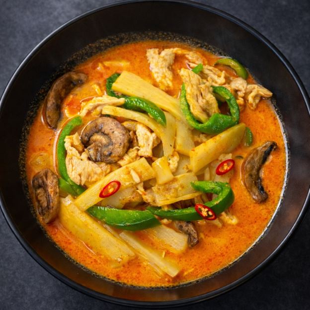 Lemon grass, straw mushrooms, green onions, cilantro, coriander leaves and lime leaf in a spicy Thai chili broth.