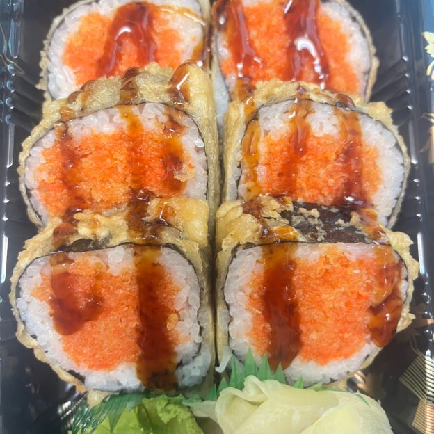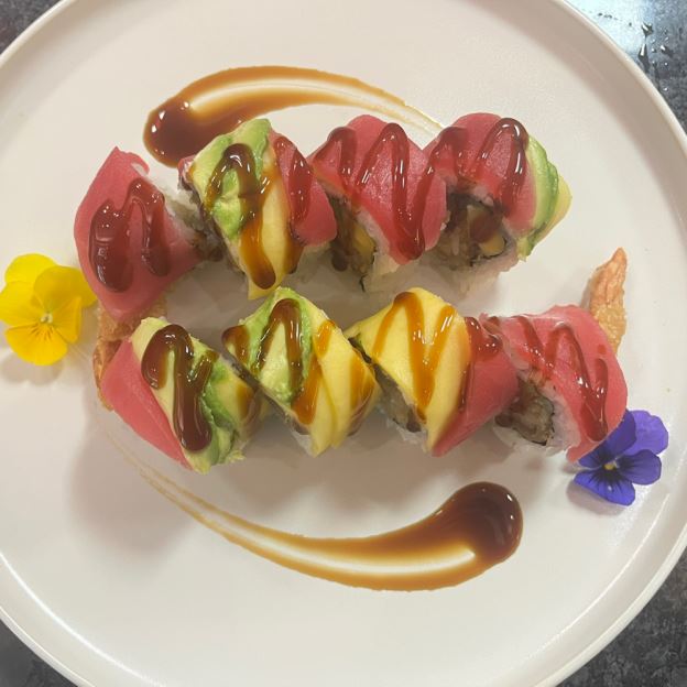 Crispy crabmeat tempura, bottom with lettuce, spicy mayo & eel sauce on the top finish with tuna, salmon, red snapper & ponzu sauce