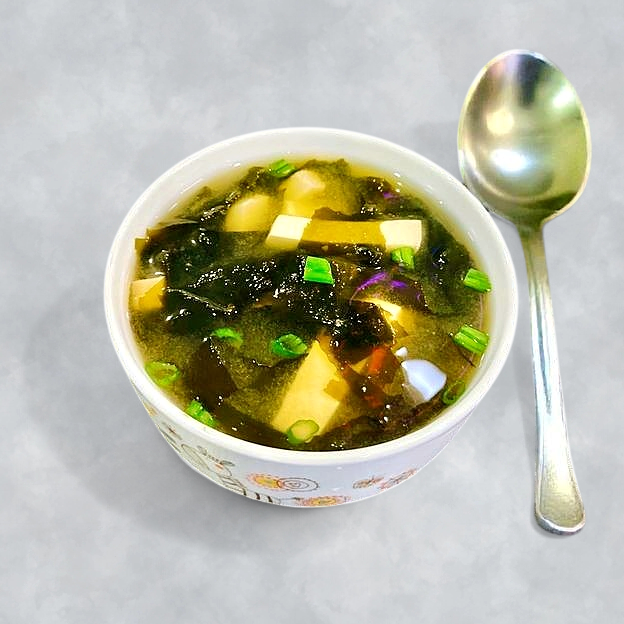Silky tofu cubes, seaweed, and green onions in a savory miso broth.