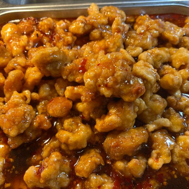 Chunk of chicken deep-fried with batter and sauteed in orange peel and our hot sauce
