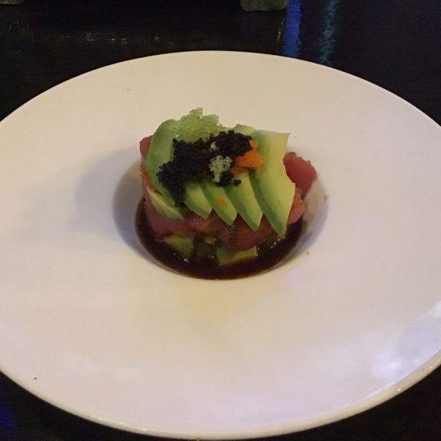 Lobster salad and chopped avocado crunchy with wasabi mayo, caviar, wrapped in paper thin tuna