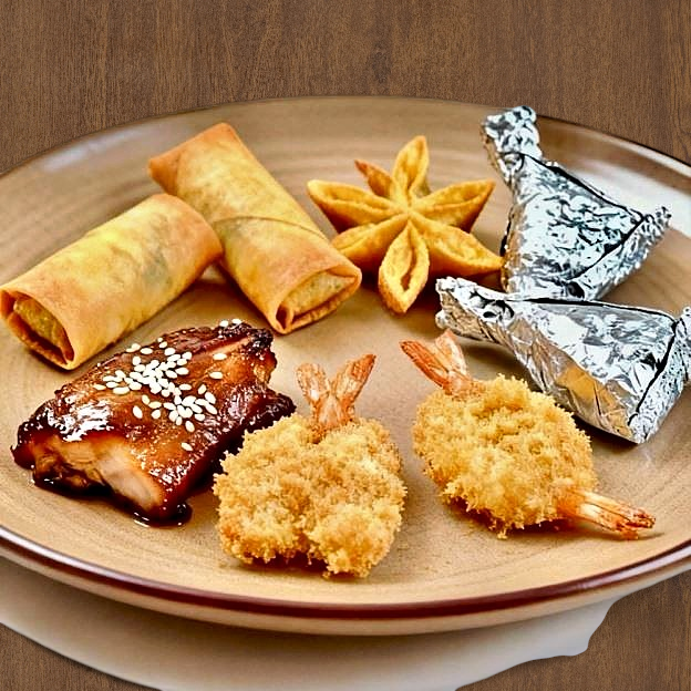 An assortment of our famous appetizers 2 roll, 2 rangoons, 2 fried shrimp and BBQ pork.