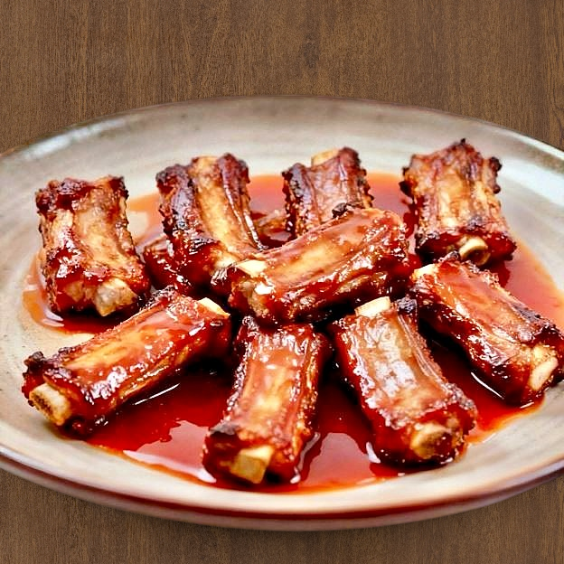 Succulent BBQ pork ribs marinated with house BBQ sauce to perfection