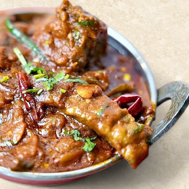 Tender goat chunks dry-roasted with South Indian spices, curry leaves, and chilies for a bold, smoky flavor.