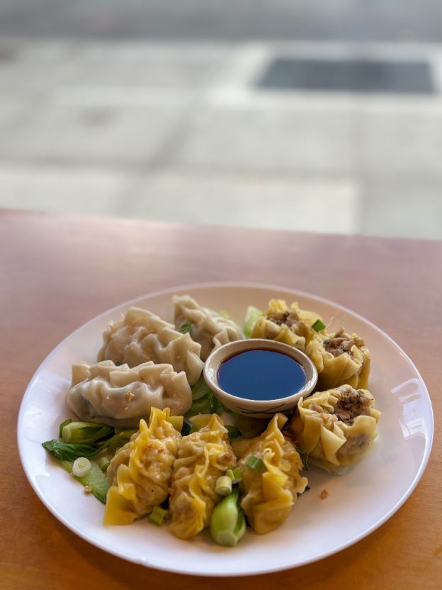 3 Chicken Dumplings & 3 Veggie Dumplings & 3 Shrimp Wonton: ingredients; water chestnut, cilantro, mushroom