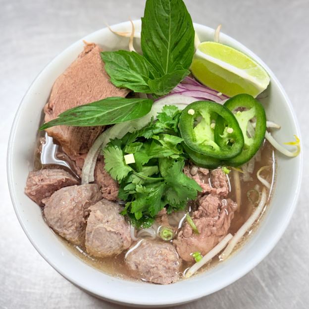Vietnamese rice noodle soup in 8 hours broth topped with onion, cilantro, bean sprout and basil