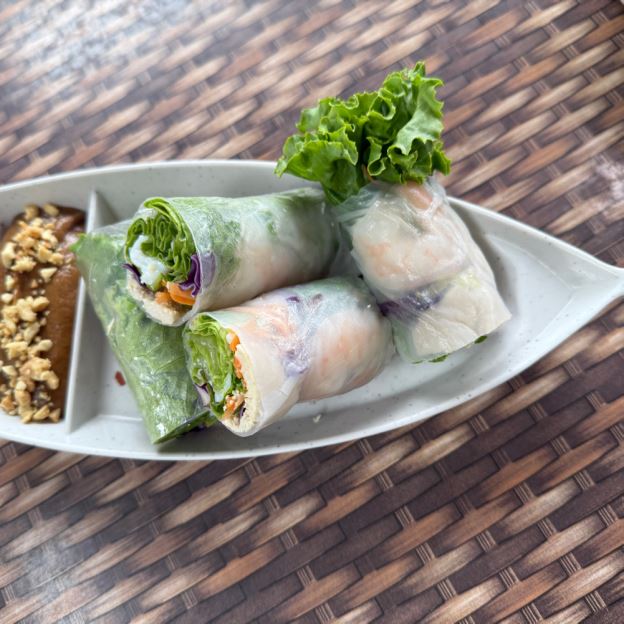 Vietnamese spring rolls, lemon grass chicken and shrimp rolled on rice paper with lettuce, mint and rice noodles served with peanut sauce (Gluten-Free)
