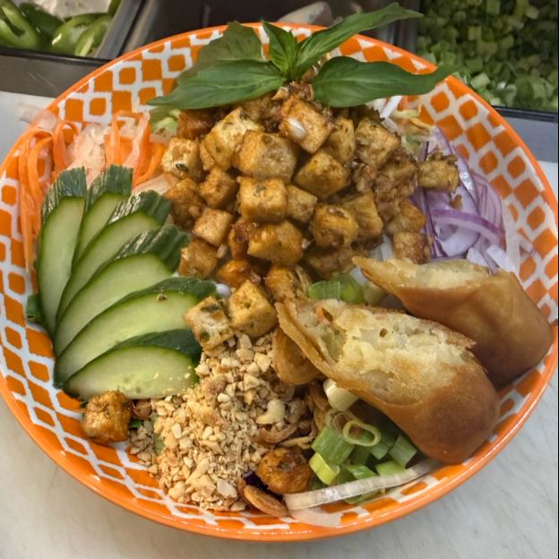Vietnamese vermicelli noodles served with fresh herbs, salad, pickled veggies, peanuts and fish sauce dressing