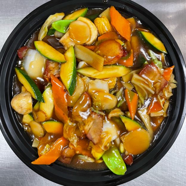 Beef, shrimp, sliced breast of chicken with vegetables in chicken broth.