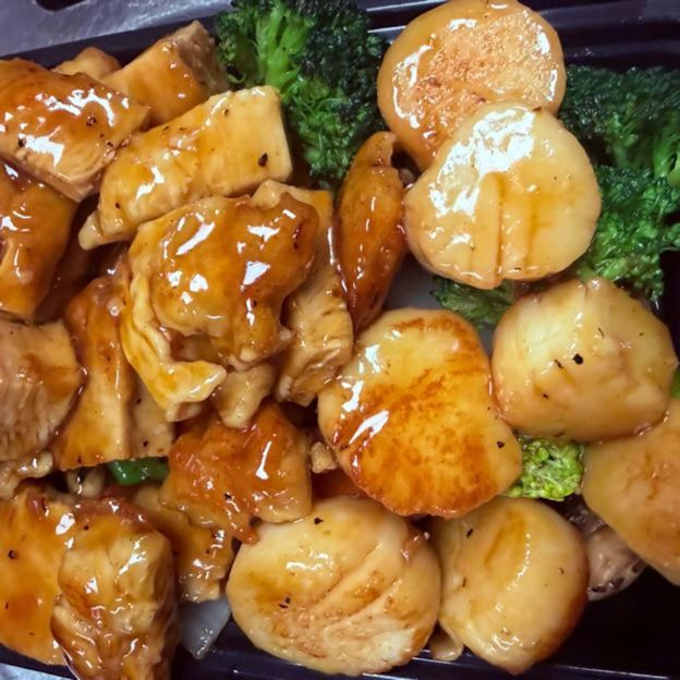 Lunch available Mon-Sat till 4pm. Served with appetizer, ginger salad, miso soup and California roll. Choice of healthy brown rice, white rice, extra charge for fried rice. Extra charge for Salmon, Beef, Shrimp
