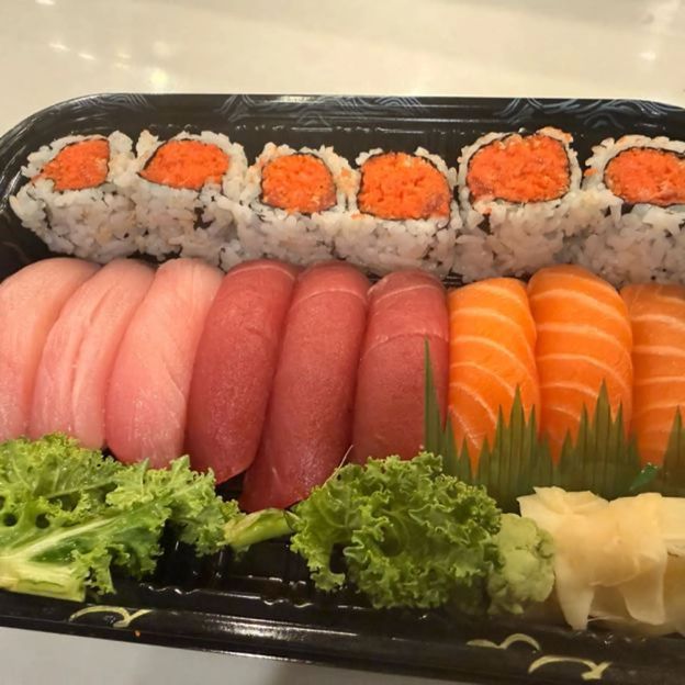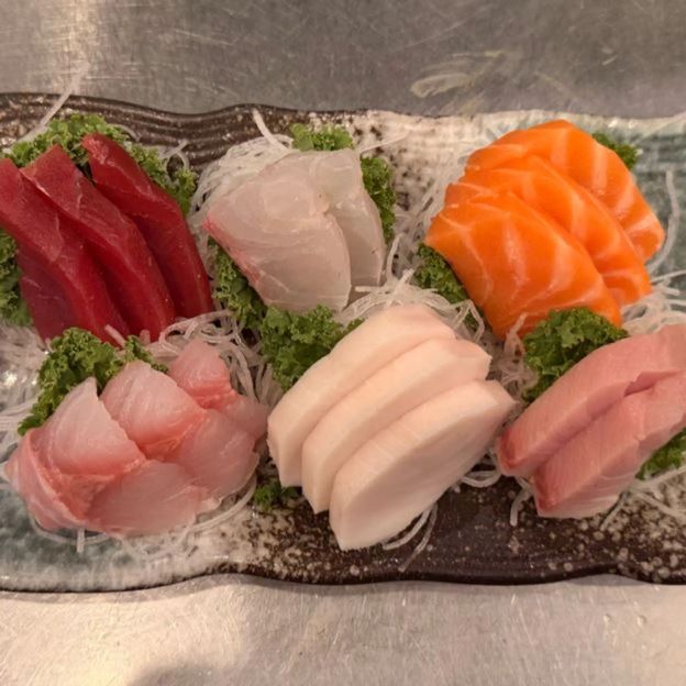 6 pieces of sashimi, 4 pieces of sushi, and California roll.