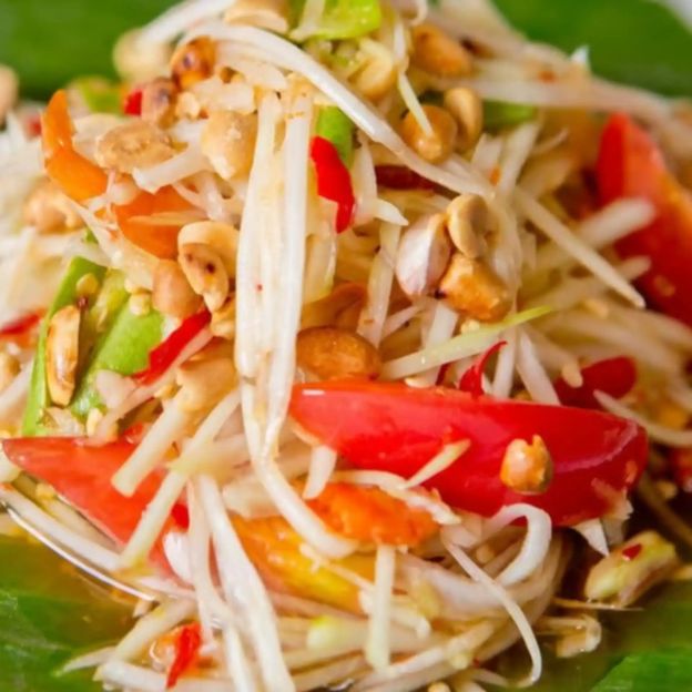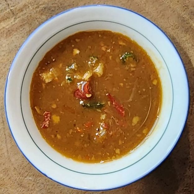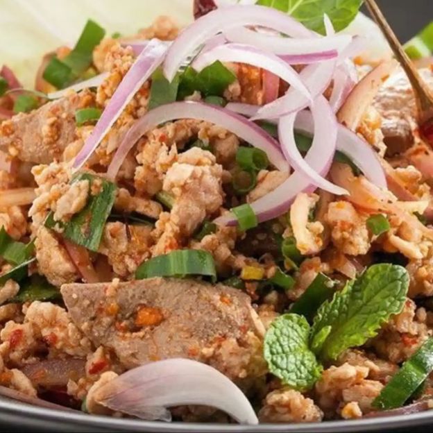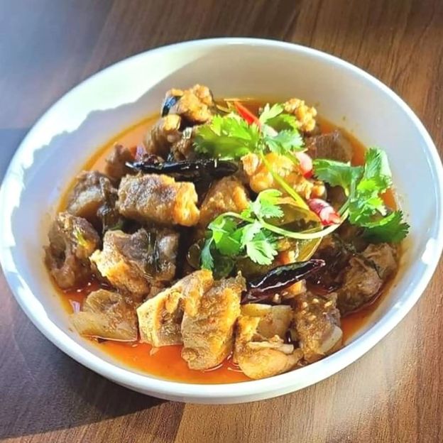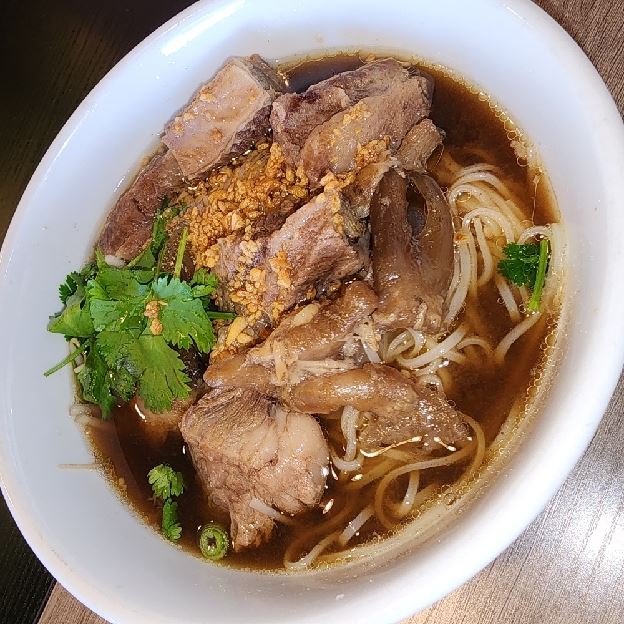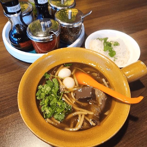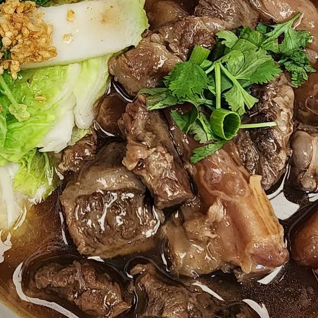 Tender beef, tendon, and tripe in a hot and sour herb soup with red chilies, lemongrass, and fresh herbs, served with Jasmine rice.