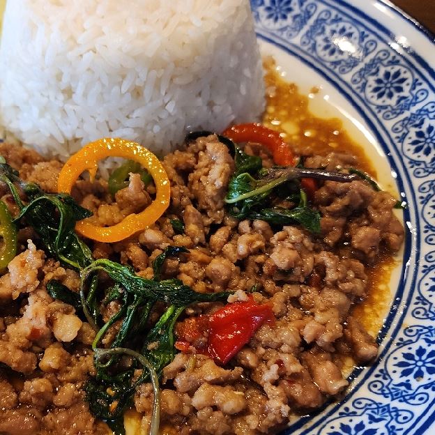 Tender chicken thigh in spicy Panang curry, topped with lime leaves, paired with fragrant Jasmine rice.