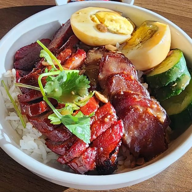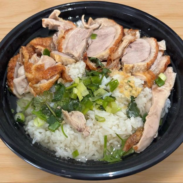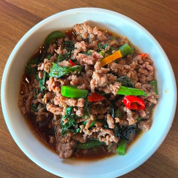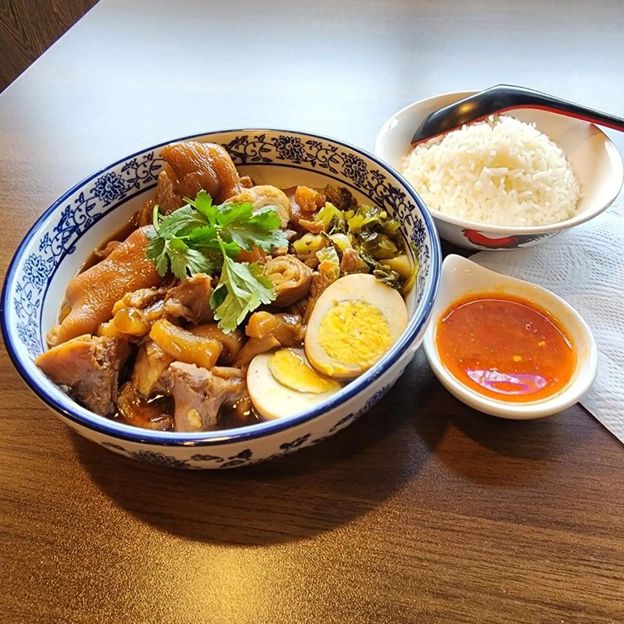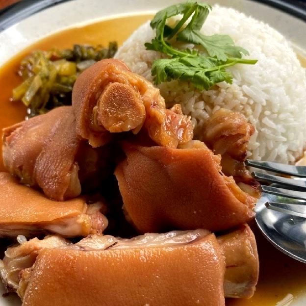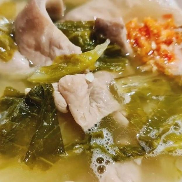 Tangy mustard greens with tender pork and offals, paired with fragrant Jasmine rice.