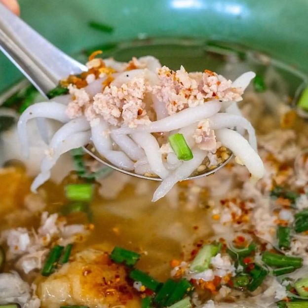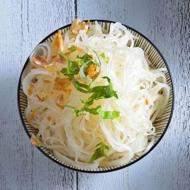 Savory Cha Lua, ground pork, crispy fried shallots, aromatic garlic, fresh scallions, and vibrant cilantro over delicate rice noodles.