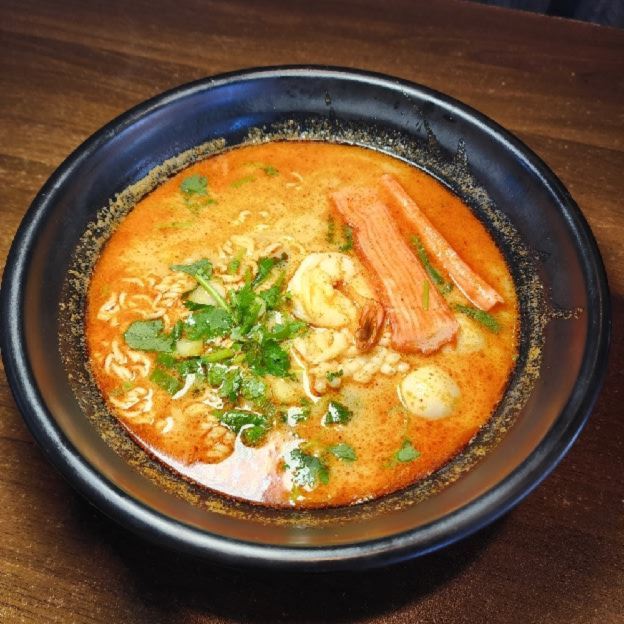Instant noodles with seafood (shrimp, octopus ball, crab stick, fish balls) in spicy creamy Tom Yum Soup, garnished with scallion and cilantro.