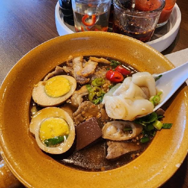 Savor rice roll noodles with pork, offal, fried pork belly, soy egg, and tofu for a hearty delight.