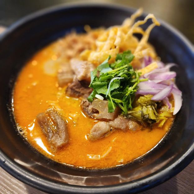 A rich, fragrant coconut curry noodle soup from Northern Thailand, typically made with beef or chicken, egg noodles, served with customizable toppings like pickled mustard greens, red onion, and chili oil, balances savory, sweet, sour, and spicy notes, with a creamy broth.