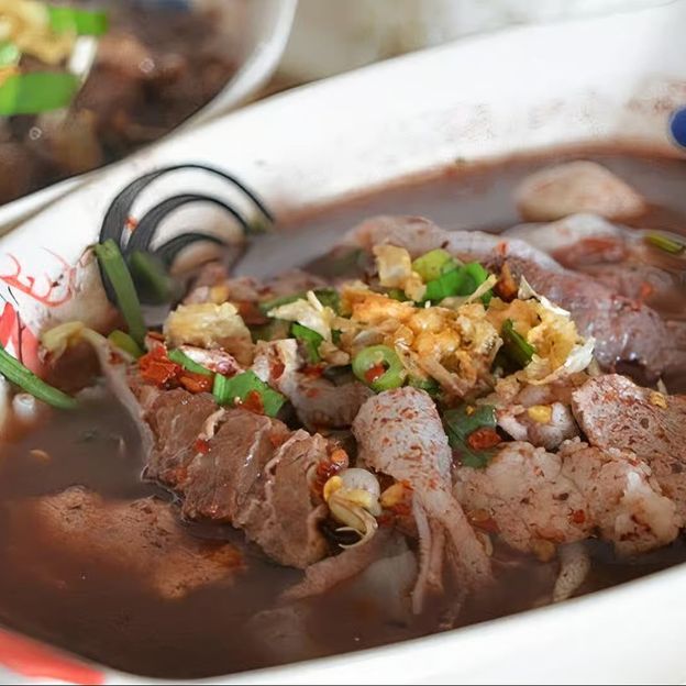 Spicy pork and offals soup with bean sprouts, scallion, cilantro, fried garlic, and ground peanuts.
