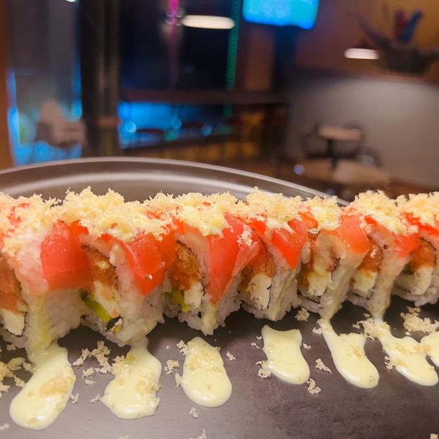 Fresh Salmon wrapped with spicy kani and avocado. Garnished with caviar , eel sauce and spicy mayo