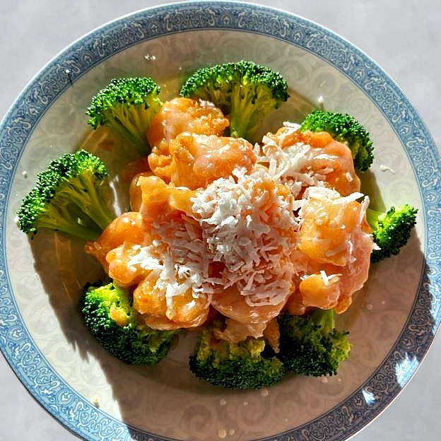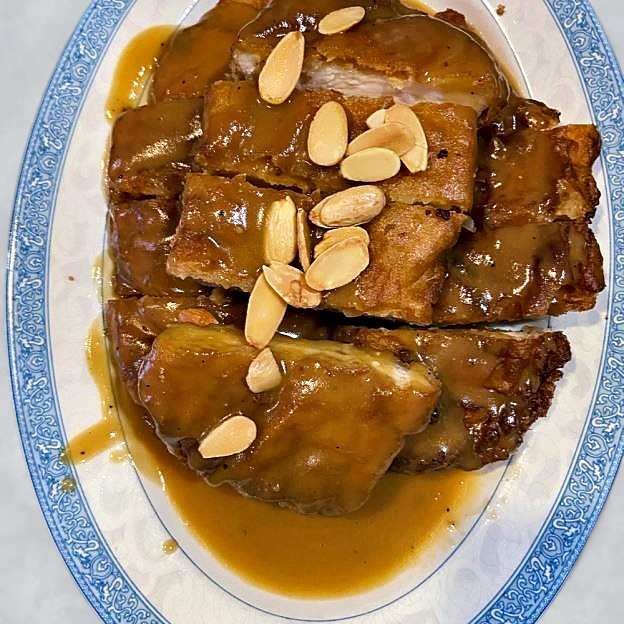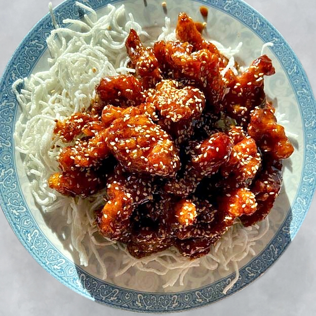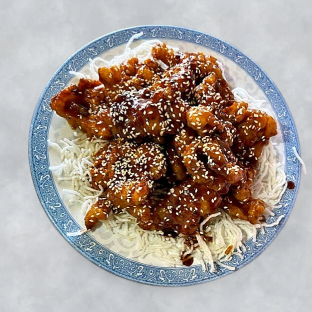 Crispy chicken tossed in a light sweet sauce the sprinkled w/ sesame seeds