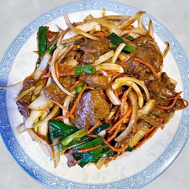 Sliced tender white chicken meat with onion in a szechwan sauce