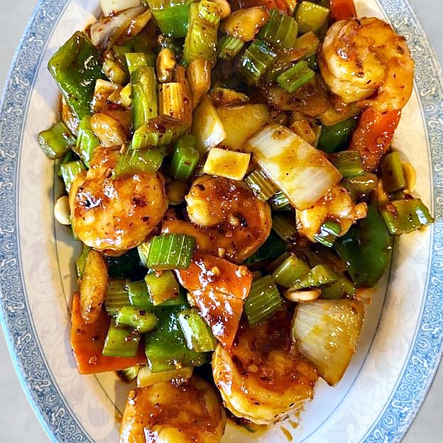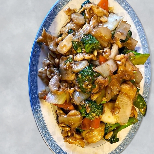 Diced chicken & vegetables, cooked with nuts in a spicy pepper sauce