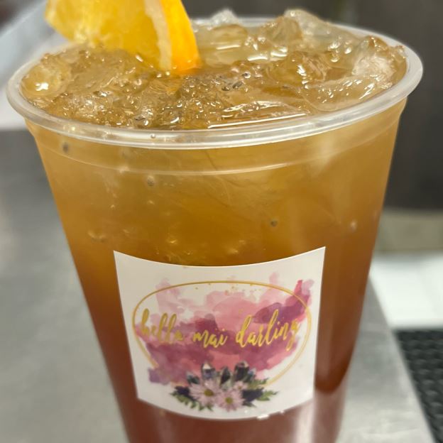 Black tea, non dairy creamer, sugar, rose syrup, cheese foam, rose petals