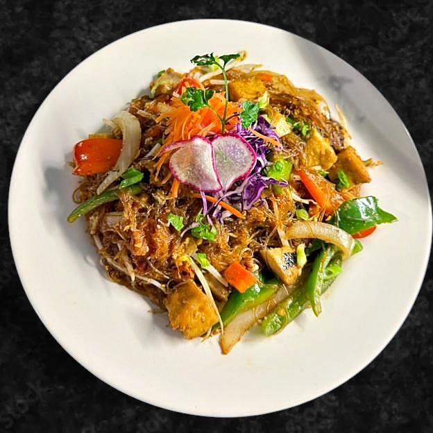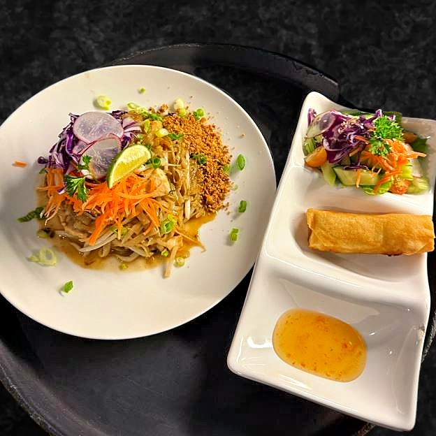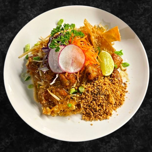 Thailand's famous stir-fried nee noodles with egg, tofu, bean sprouts, crushed peanuts, and your choice of protein