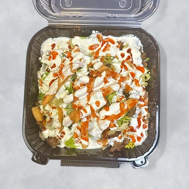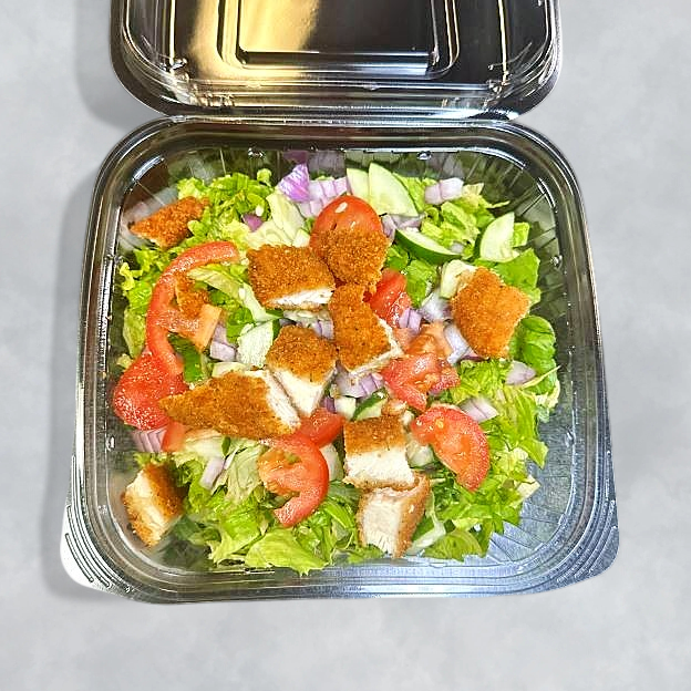 Grilled chicken, Onions, feta cheese, lettuce, tomatoes, and tzatziki sauce