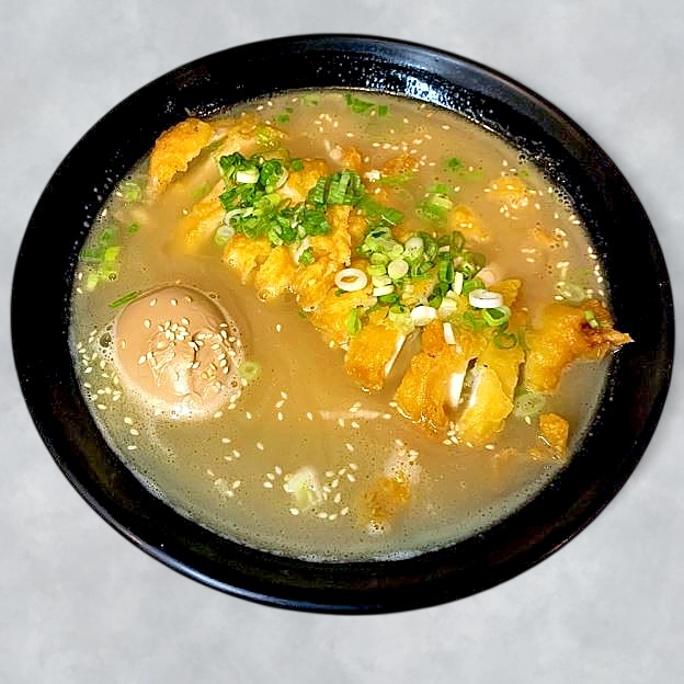 Creamy chicken flavor broth top with katsu chicken and green onion.
