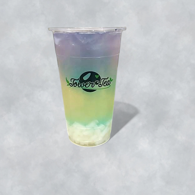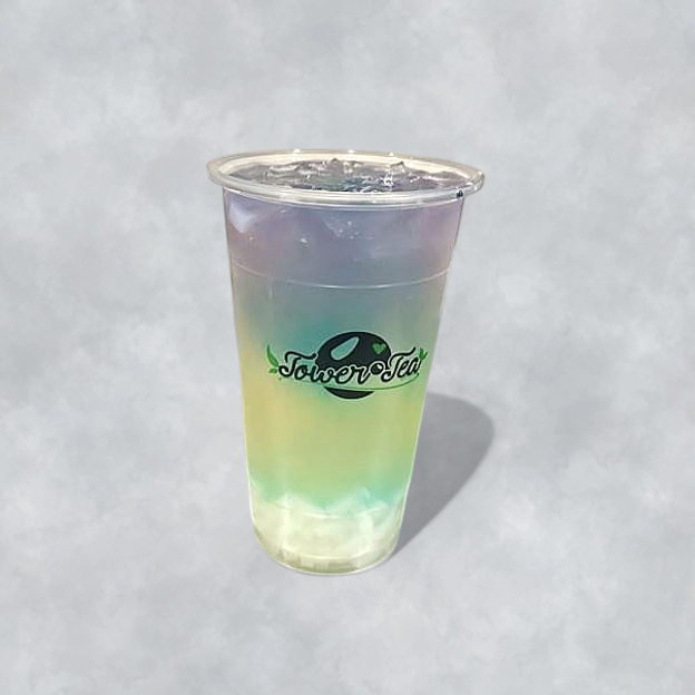 Iced Lychee Green Tea with Butterfly Pea tea and Lychee Jelly.
