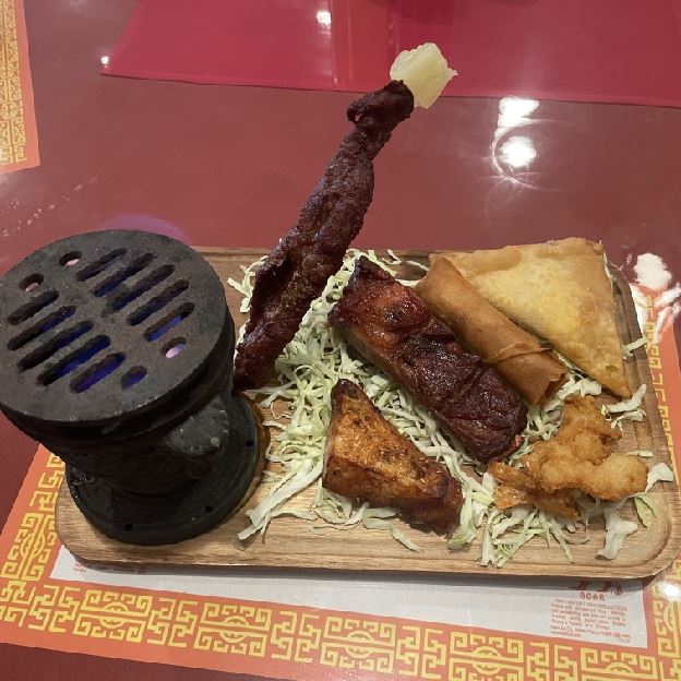 Eggroll, Crab Rangoon, BBQ Ribs, Beef Sticks, Butterfly Shrimp and Shrimp Toast.
