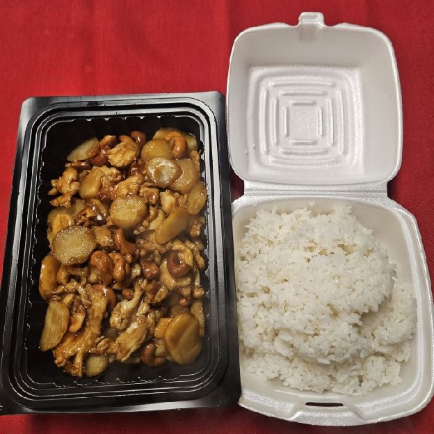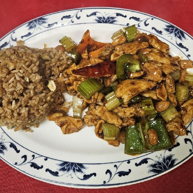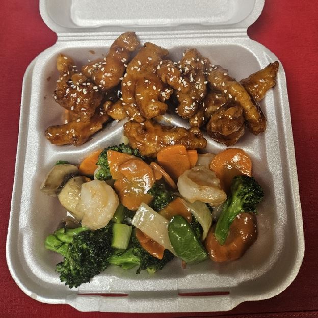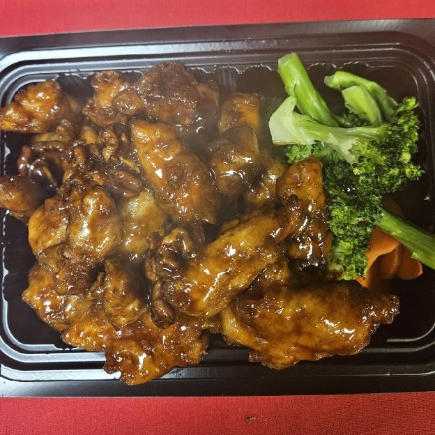 Large Pieces of Chicken. Deep Fried. Sauteed in Brown Sauce with Sesame Seeds. Broccoli and Carrot