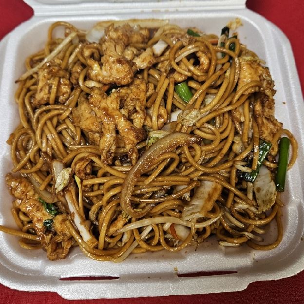 Wok fried lo mein (soft noodle) with chicken and shredded vegetable (carrots, napa, celery, bean sprouts, green & white onion)