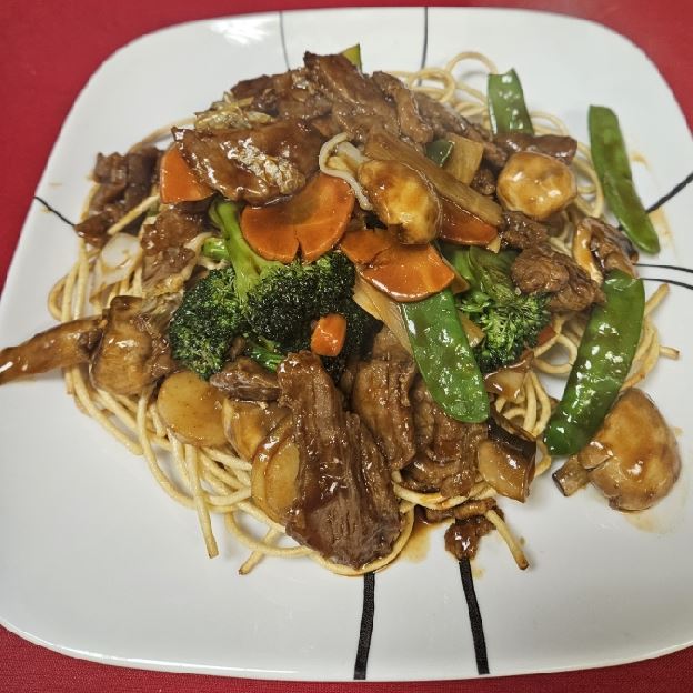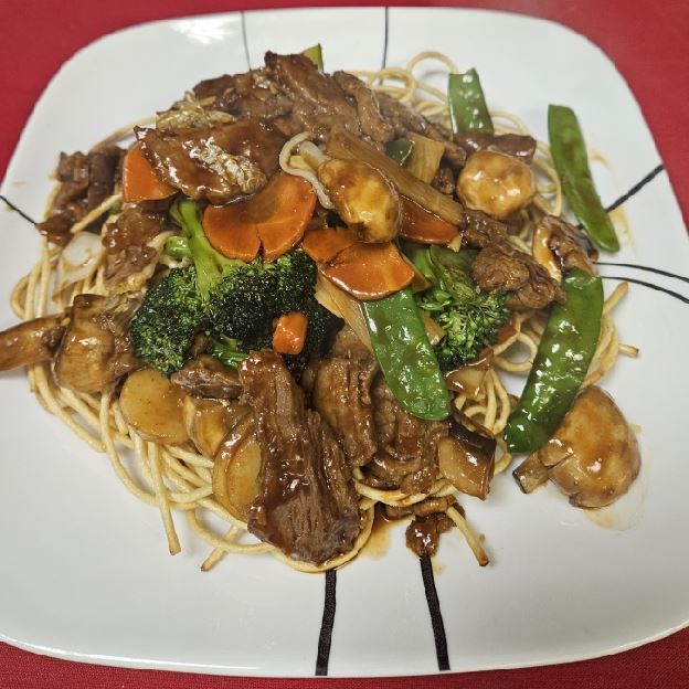 Wok fried lo mein (soft noodle) with beef and shredded vegetable (carrots, napa, celery, bean sprouts, green & white onion)