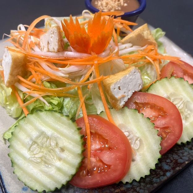 Lettuce, tomatoes, carrots, bean sprouts, cucumbers, and tofu served with sweet vinegar and peanut sauce.