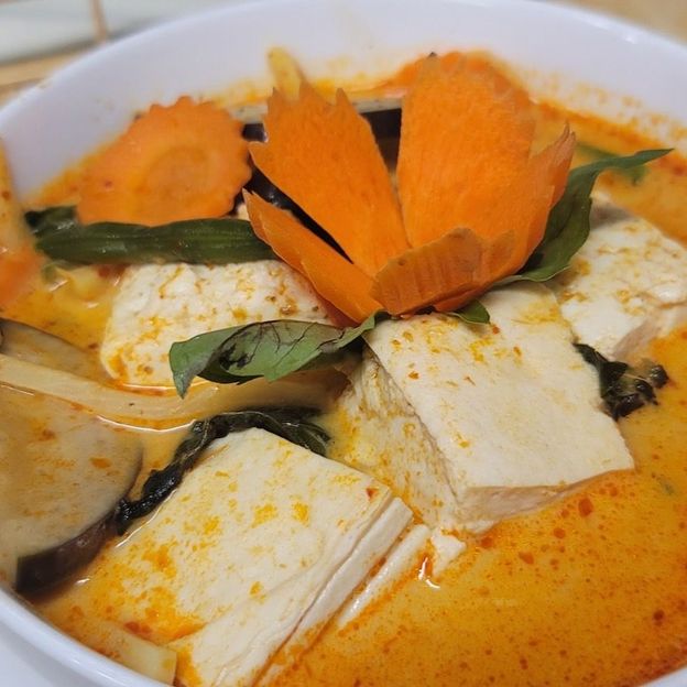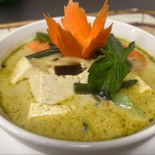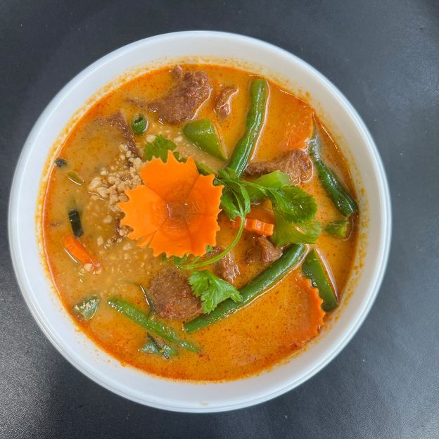 Coconut milk, bamboo shoots, bell peppers, carrots, string beans, eggplants cooked in red curry.