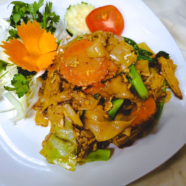 Fresh flat noodles, richness of black sweet soy sauce flavor, and Chinese broccolis.