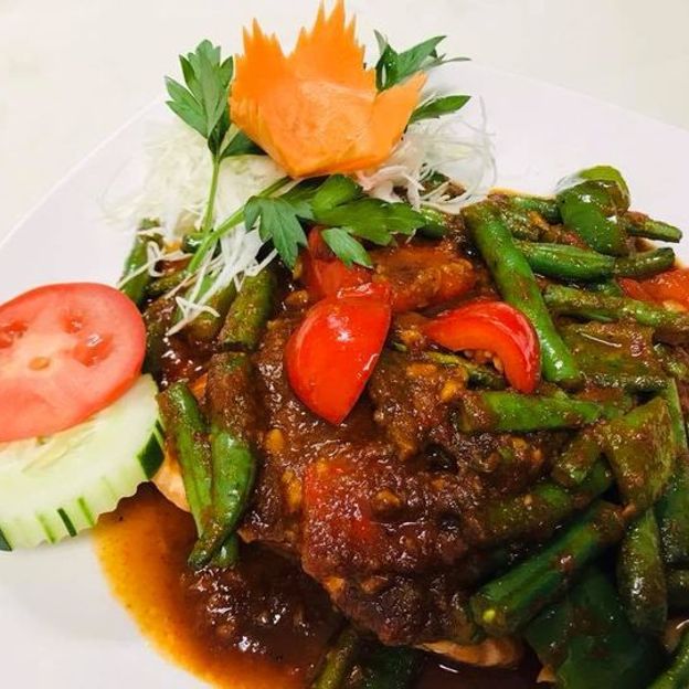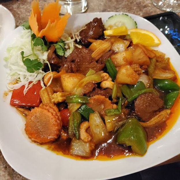 Cashew nuts, pineapples, bell peppers, onions, carrots, baby corn, celery, scallion with roasted chili paste.