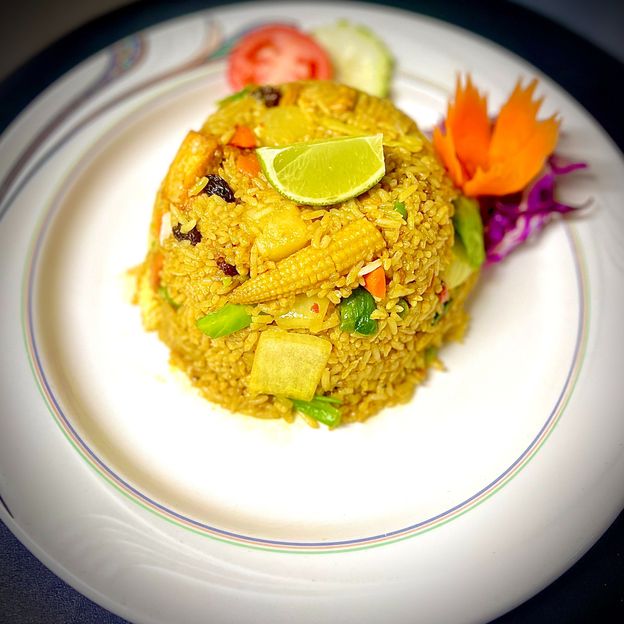 White rice, pea & carrots, scallions, tomatoes, pineapple, sauteed with curry powder, onions, carrots and raisins.