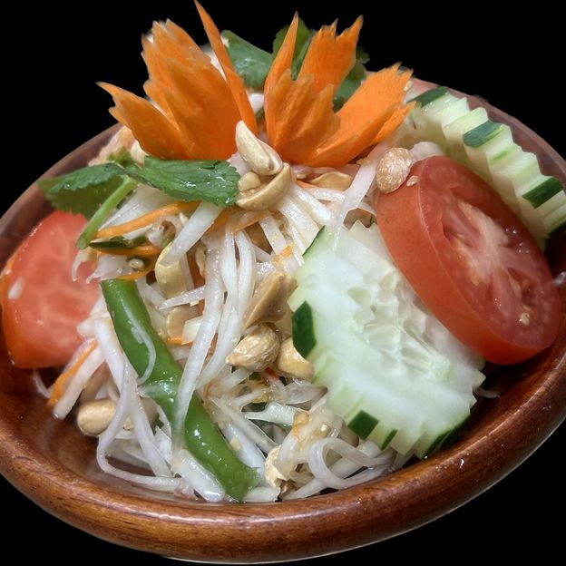 Green Papaya salad with chilies-garlic dressing, peanut, green beans, tomatoes and lime juice.