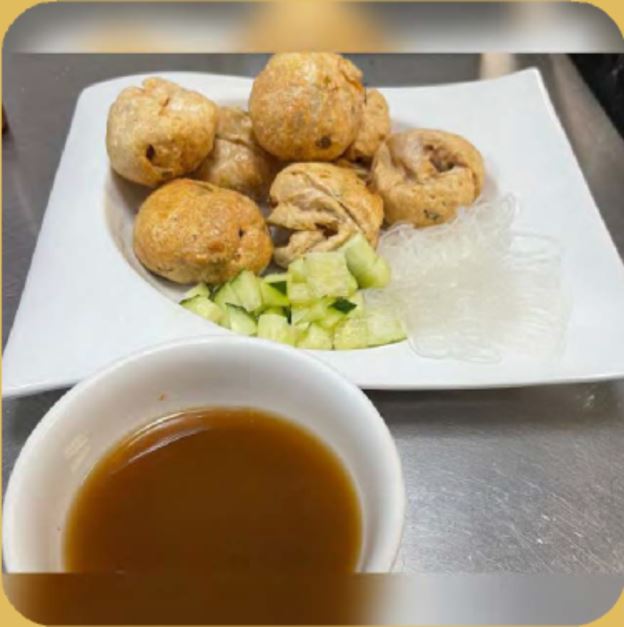 Fried meatballs with cucumber, glass noodles and sweet sour sauce