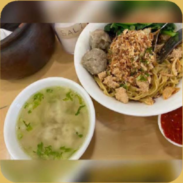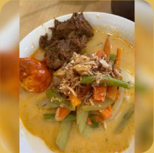 Vegetable soup with beef rendang, egg sambal, garlic cracker and rice cake