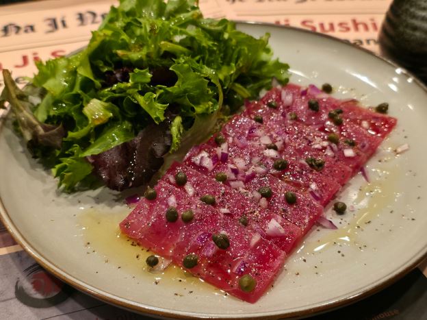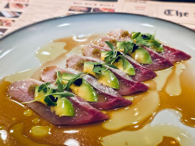 White fish tempura and avocado inside, finished with seared tuna, jalapeño and fried onions.