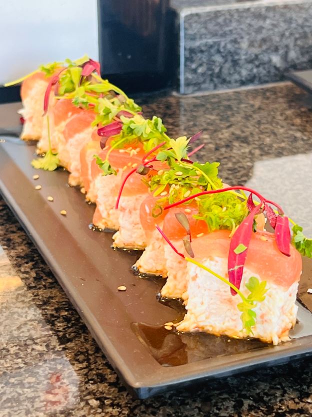 Filled with crab salad, spicy tuna and avocado, topped with salmon, jalapeño and tempura flake.