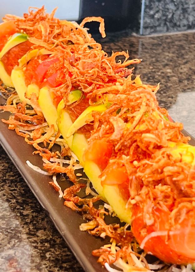 Combining spicy crab salad and avocado inside, crowned with salmon, tuna, yellowtail and fried onions.