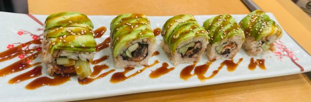 Spicy tuna and shrimp tempura inside, topped with avocado, jalapeño and tempura flake.